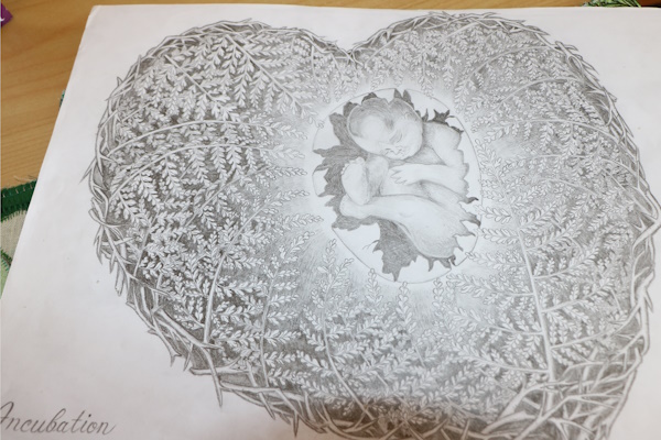 ‘Incubation’, a pencil drawing depicting “a new beginning in prison”, according to the artist.